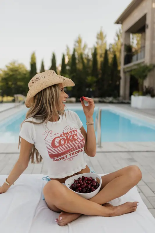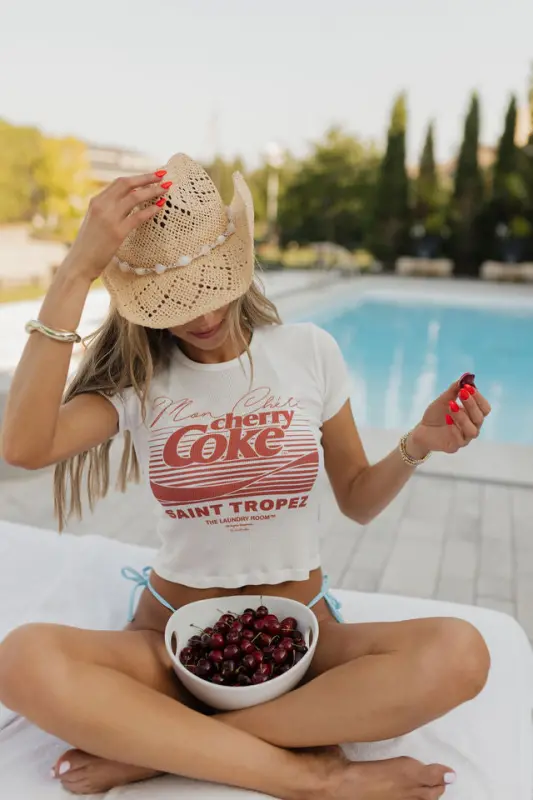 The Cherry Coke Saint Tropez Baby Tee in White by The Laundry Room is a fun, fitted graphic tee that blends nostalgic flair with modern edge. Made from lightweight, stretchy fabric, this mid-length cropped tee features bold red “Cherry Coke” lettering across a crisp white backdrop. With a classic round neckline and short sleeves, it offers a flattering, comfortable fit perfect for concerts, summer days, or Fourth of July festivities. A playful nod to Americana style, this baby tee is your go-to for effortless, USA-inspired looks.