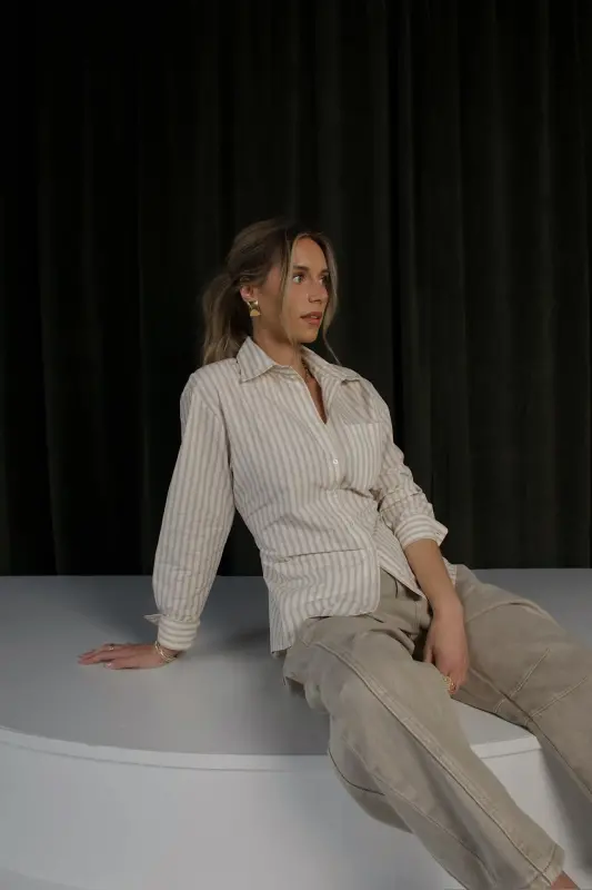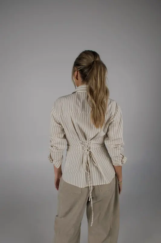 Our Collins Pinstripe Button-Up Shirt is classic with a modern twist. This cream collared shirt features a grey and white pinstripe pattern and clear button-up front closure for a clean, timeless look. Designed with drop shoulders, a functional front pocket, and split cuffs with clear button details, it blends effortless style with thoughtful detail. The adjustable lace-up tie waist in the back allows for a customizable, flattering fit. Crafted from a lightweight, non-stretch fabric, this versatile top transitions seamlessly from work to weekend—pair it with denim for a relaxed vibe or dress it up with trousers for a chic, sophisticated look.