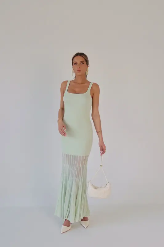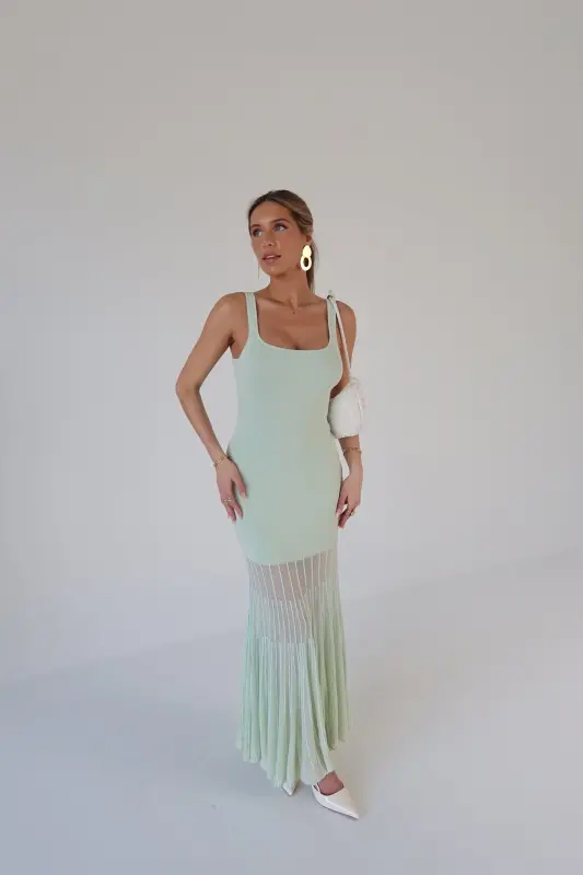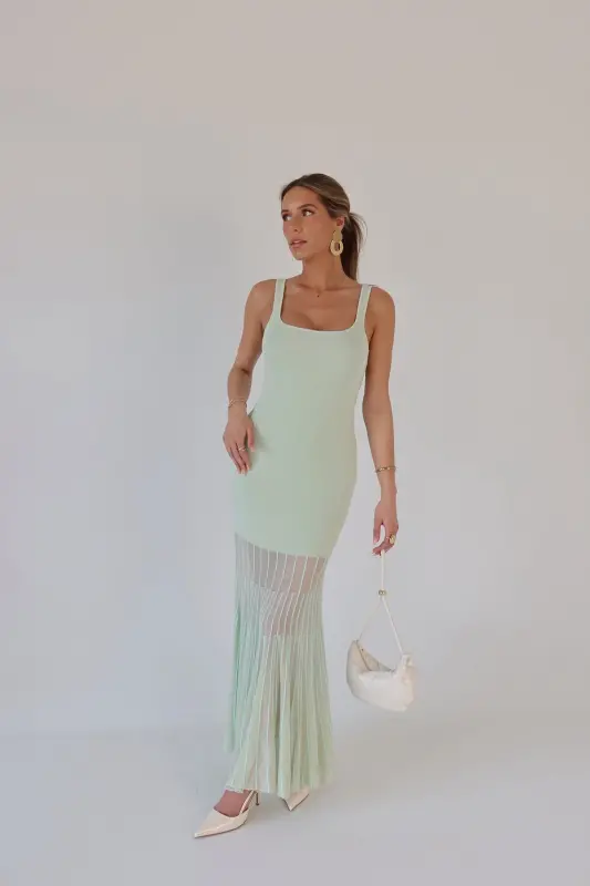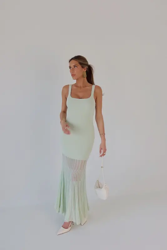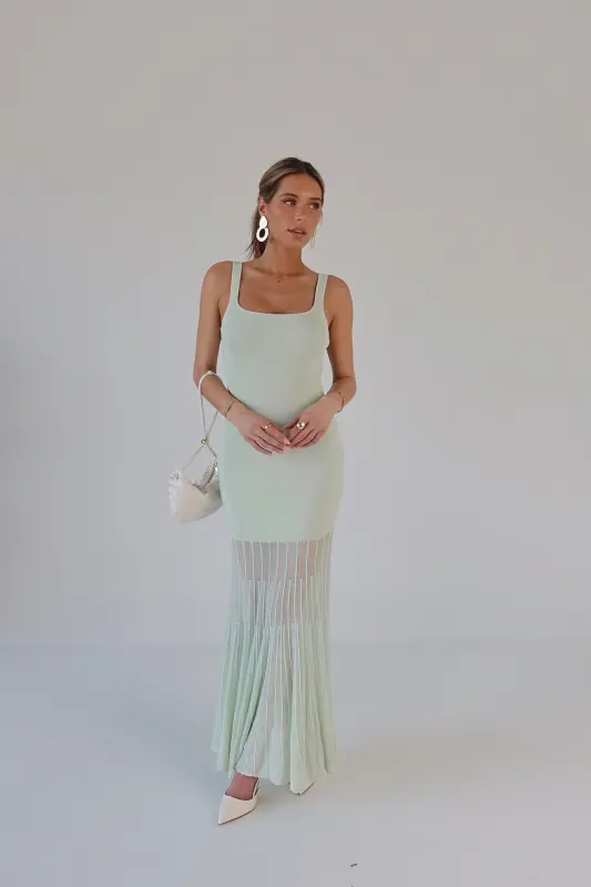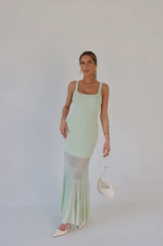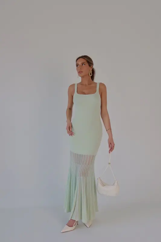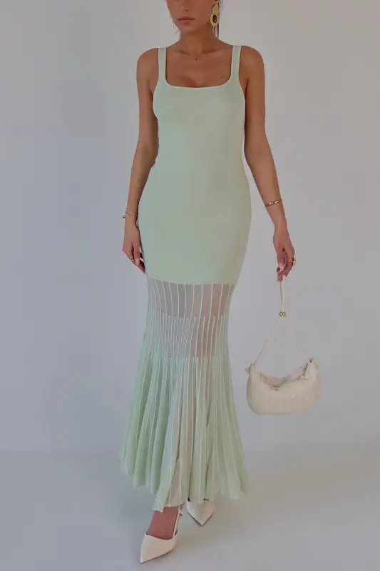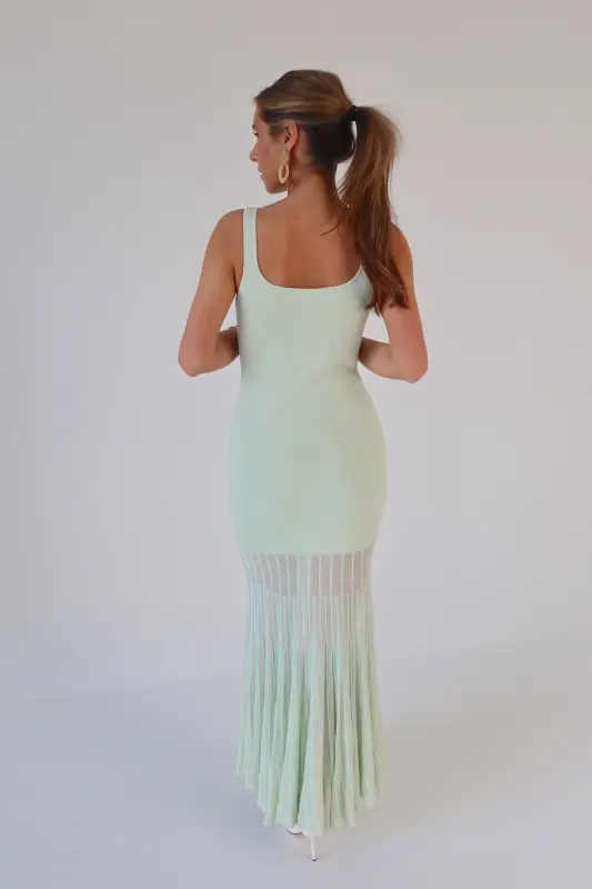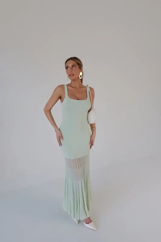 Our Kendall Mint Maxi Dress is the perfect blend of modern sophistication and timeless charm. Crafted in a refreshing mint hue, this midi dress features a structured square neckline and a flattering, curve-hugging fit. Intricate mesh paneling with a delicate lined pattern starts mid-leg, creating a subtly sheer and breathable finish with added texture and elegance. Effortlessly chic and comfortable, it’s the ideal statement piece for weddings, vacations, or any stylish occasion.