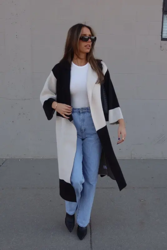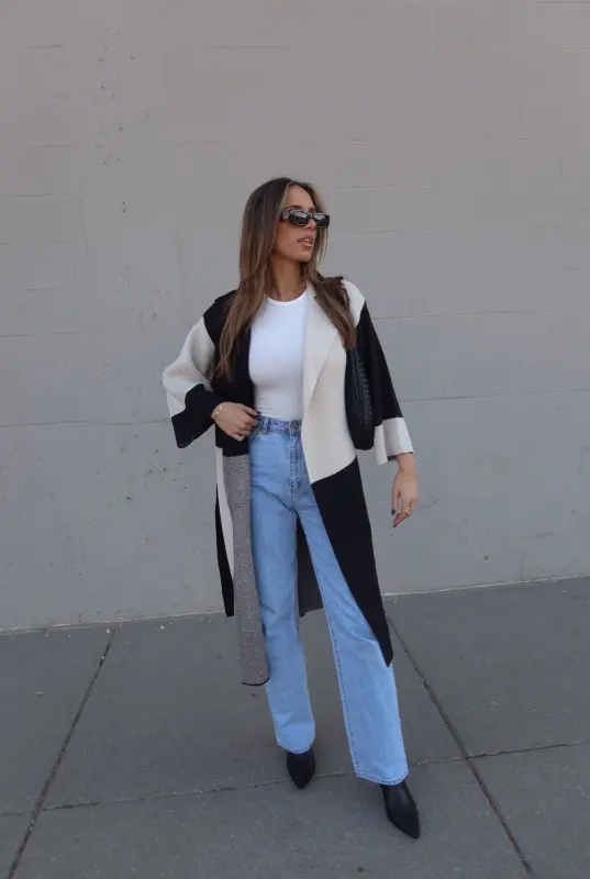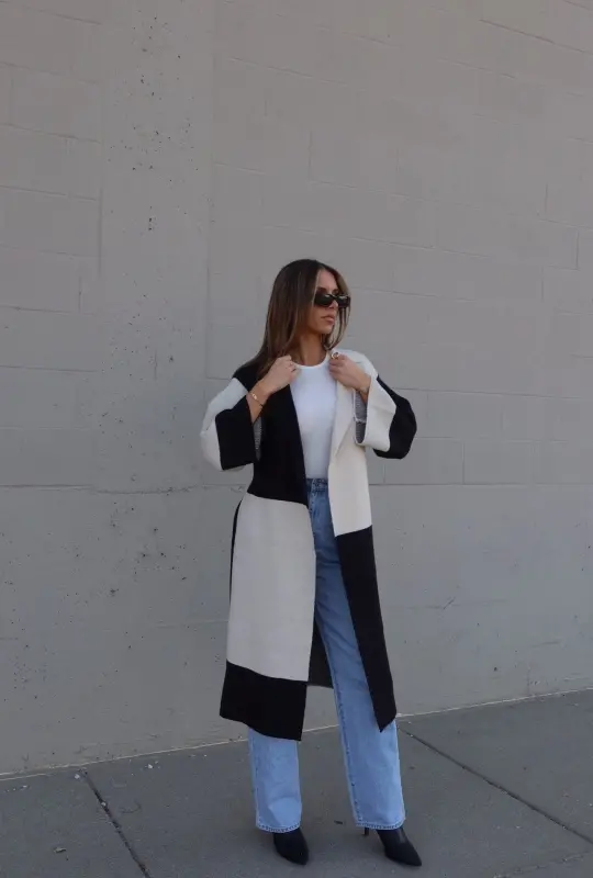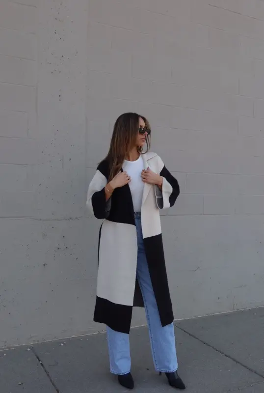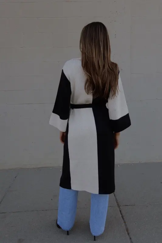 Our Knit Colorblock Trench is a full-length elongated knit trench with colorblocking details. This knit trench features a wide-collared neckline, with an oversized fit, and a tie around the waist. This knit trench has a contrasting boxy pattern and is made of a textured knit material that is thick, chic, and perfect for the cooler seasons. This knit trench has stretch, which creates a flexible fit.