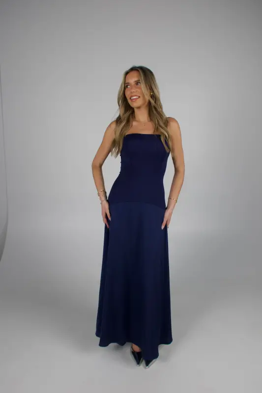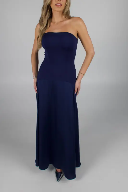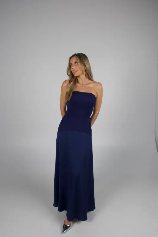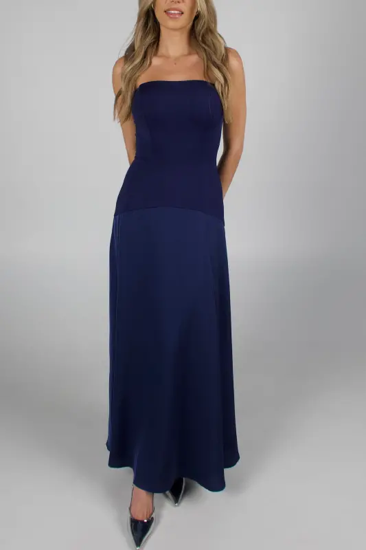 Elegant and timeless, the Midnight Satin Maxi Dress is designed to make a subtle yet stunning statement. Crafted in a deep navy hue, this strapless drop-waist silhouette features a fitted corset bodice with a straight neckline and an interior silicone gripper for a secure fit. The silky satin fabric drapes beautifully into a smooth, floor-length skirt that moves with effortless grace. Finished with a hidden back zipper closure and double lining for comfort, this dress is the epitome of sophistication — perfect for weddings, formal events, or any evening occasion this fall.
