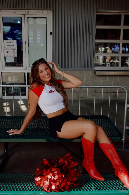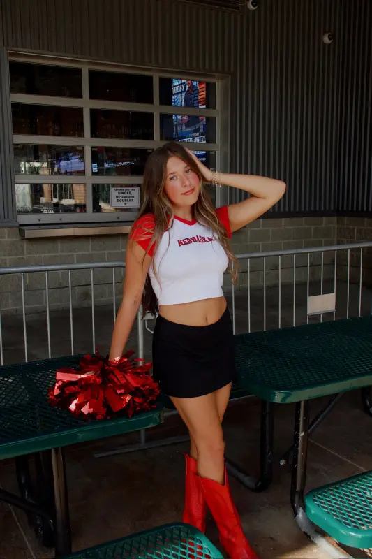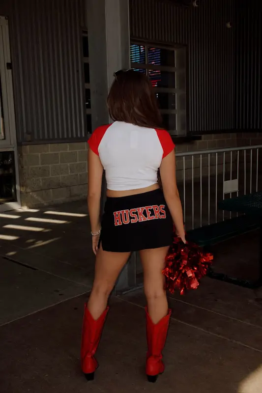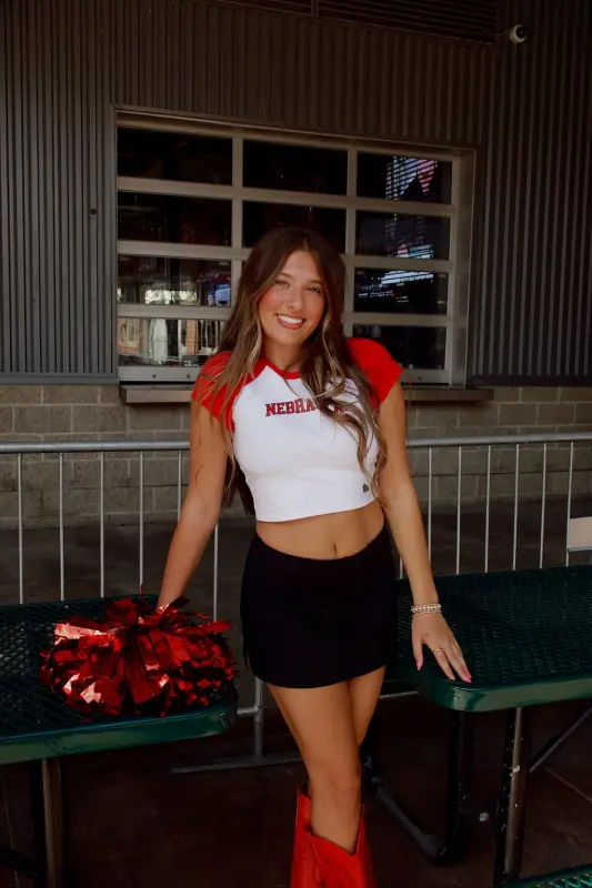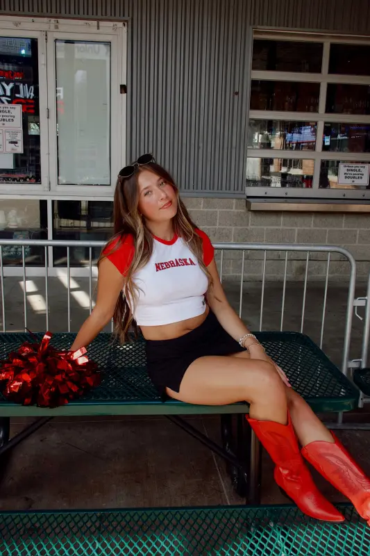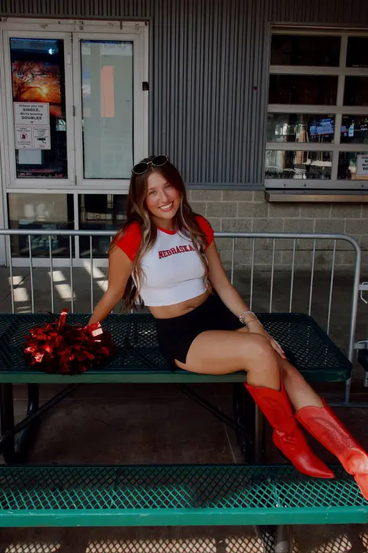 Show off your Husker pride with the Nebraska Homerun Tee, part of our Madida Exclusive 2025 Game Day Collection. This color-block baby tee features a bold red and white two-tone design with a striking Nebraska graphic, making it the perfect pick for game day or casual wear. The cropped fit adds a trendy edge while keeping it comfortable and versatile—pair it with your favorite high-waisted bottoms for an effortless Husker look. A game day must-have for every Nebraska fan!