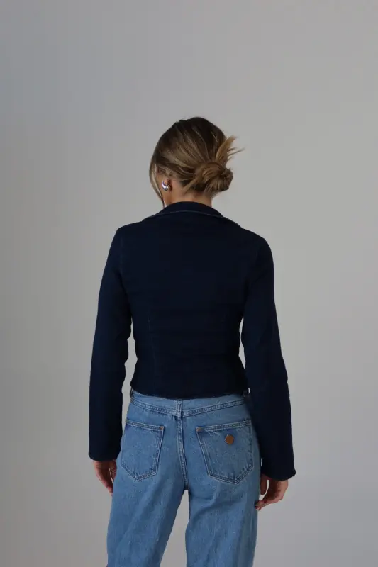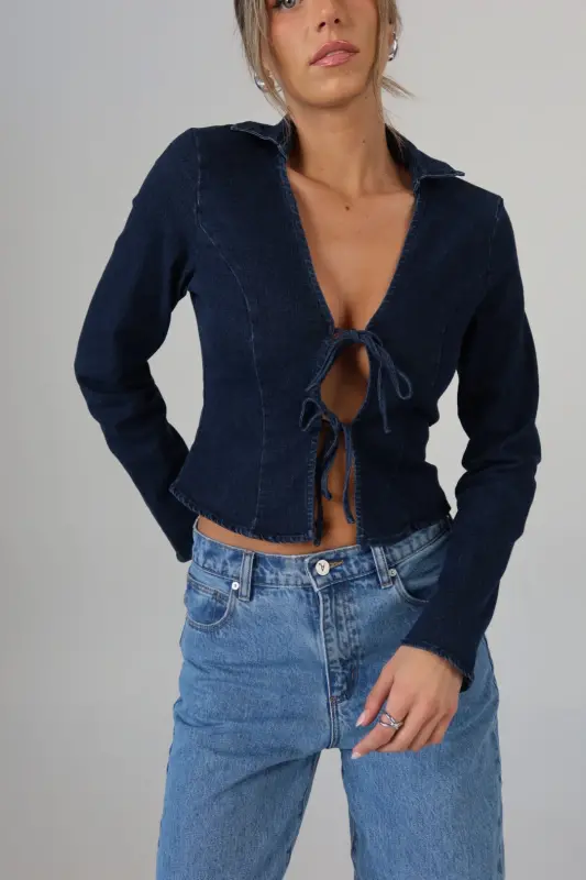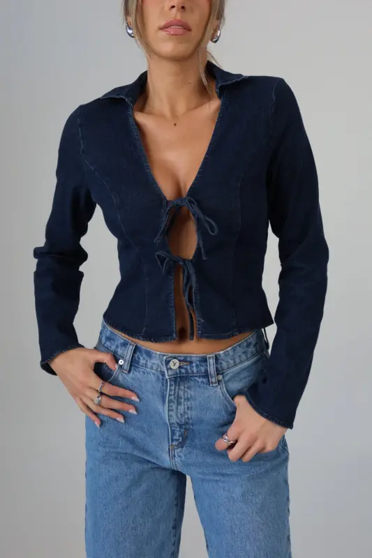The Stretch Denim Tie-Front Collared Top is the perfect mix of casual and chic. This cropped long-sleeve top features adjustable front ties, allowing you to create a customized fit that flatters your silhouette. The classic collar detail adds a touch of sophistication, while the stretch denim fabric ensures both comfort and style. Ideal for pairing with high-waisted jeans or skirts, this top is a versatile addition to your wardrobe that transitions effortlessly from day to night.