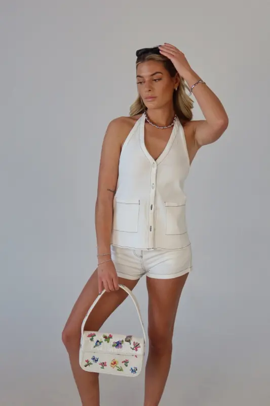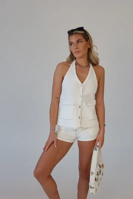 Make a bold statement with the Tayle Contrast Stitch Denim Halter Top, a trendy and unique must-have. Designed with striking black contrast stitching against off-white denim, this top exudes effortless style. Crafted from a stretchy material for a comfortable yet flattering fit, it features functional pockets and monochromatic buttons for a chic touch. The full-length halter design ties around the neck, showcasing a flattering v-neckline and a stunning open back. True to size and designed to enhance your silhouette, this halter top is the perfect piece to elevate your wardrobe with a fresh and modern twist!
