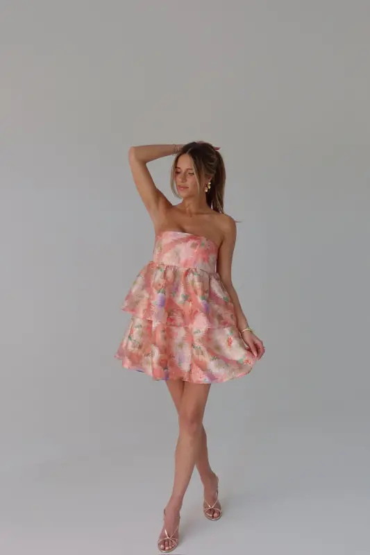 Make a bold and beautiful entrance in our Trinity Strapless Mini Dress — a show-stopping statement piece designed to turn heads. This voluminous, tiered mini dress features a whimsical blend of soft peach, delicate green, dreamy purple, and creamy neutrals, creating a vibrant yet elegant multi-color palette perfect for spring celebrations. The flattering fit-and-flare silhouette is complemented by a structured, fitted bust with grip lining for all-day comfort and confident movement. Double lined for a luxe feel, this strapless stunner includes a secure back zipper closure for a fitted feel. Whether you're a wedding guest, graduate, or simply dressing to impress, the Trinity is your go-to for floral-forward sophistication and unforgettable style.
