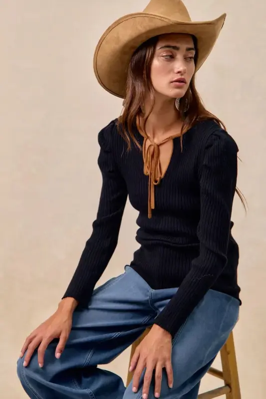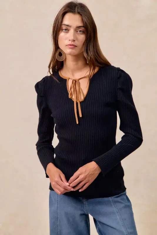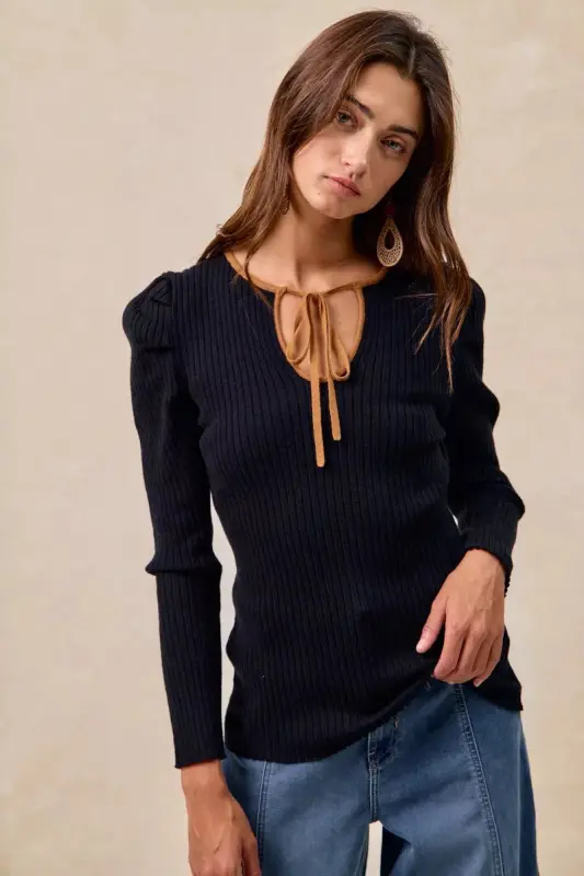 Stylish ribbed top with a contrast front tie and shirred detailing for a flattering silhouette. Versatile enough for casual or dressy occasions, this chic piece effortlessly elevates any outfit with modern flair and comfort.