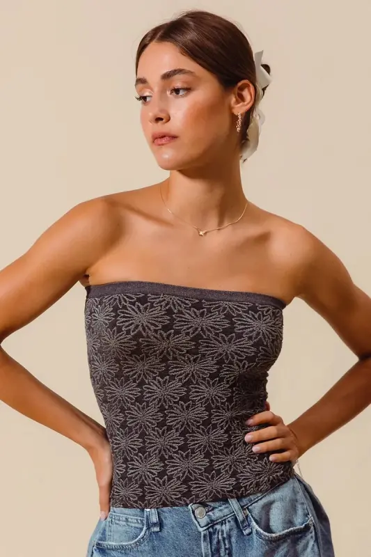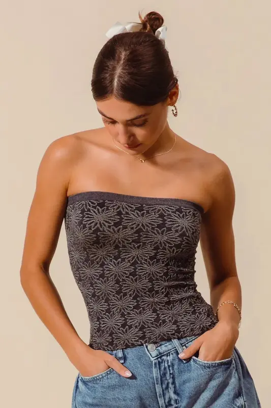 This strapless tube top features a stylish two-tone jacquard floral design. Made from stretchy, breathable fabric, it offers a comfortable, flattering fit. Its seamless, cropped style pairs easily with jeans, skirts, or layers for both casual and dressy looks.